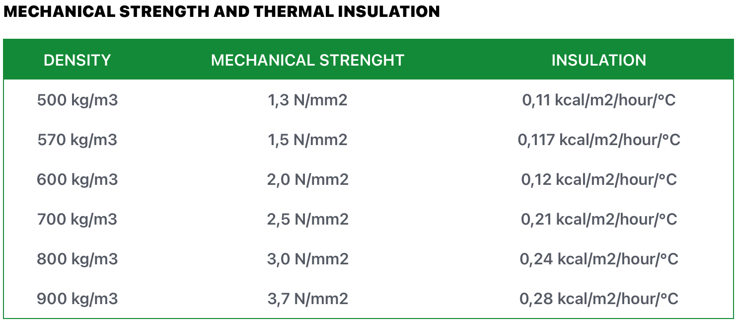 These properties correspond to values for mechanical strength, thermal insulation, and acoustic insulation.